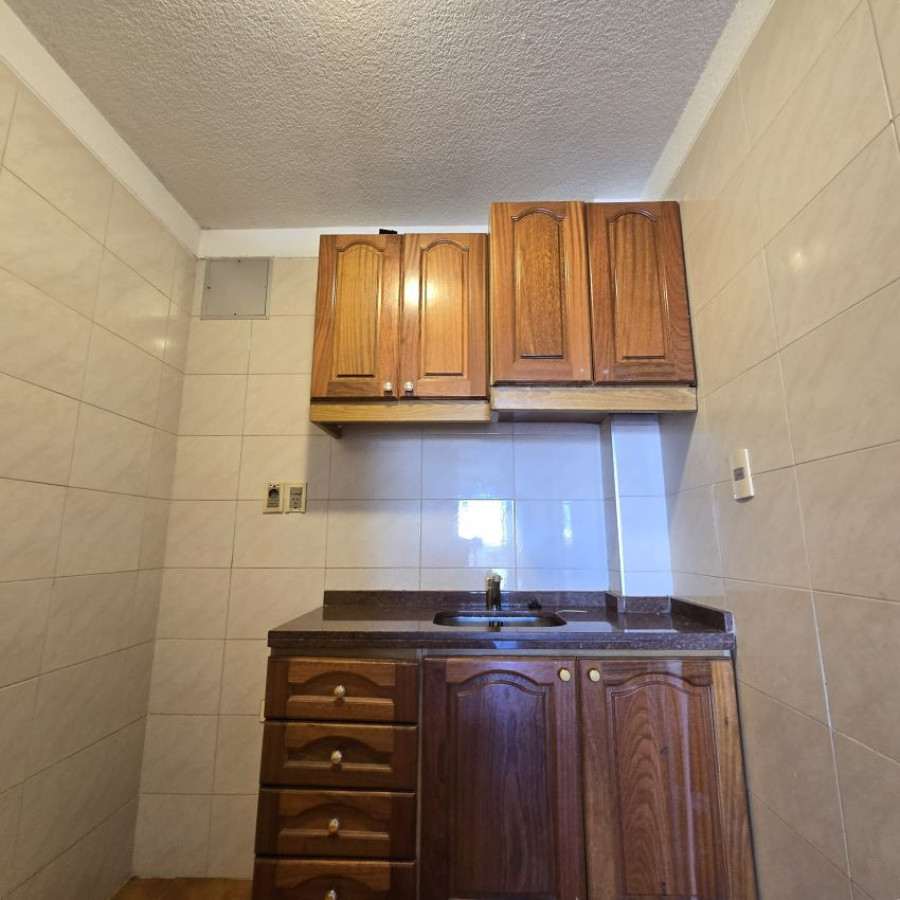 Ambiente de 32mt2 con piso de parque sub dividido por paredes de yeso y puertas corredizas en 3 ambientes y cocina definida. Salida al balcón en contrafrente por ventanal.